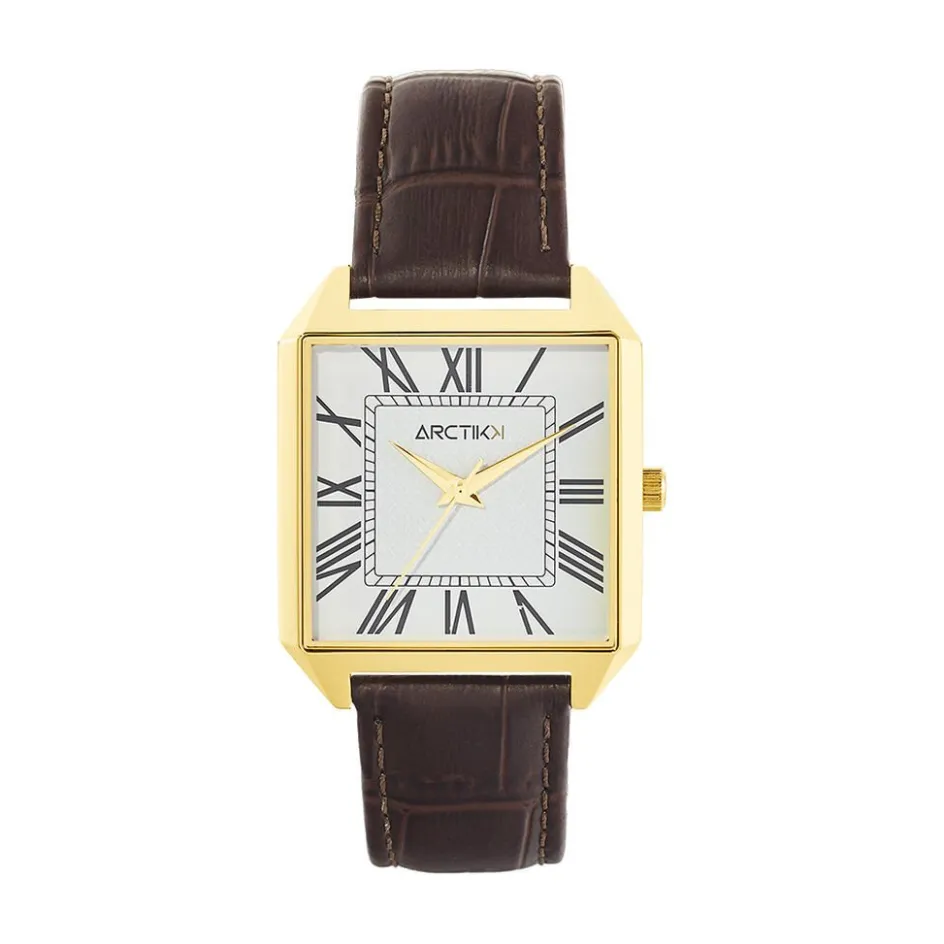 Montre Arctik Retro Acier Dore Carree Quartz 33mm Fond Blanc Bracelet Cuir Vache Effet Alligator Marron P101196-b