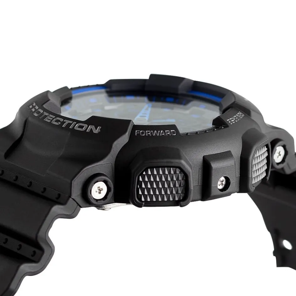 Montre Casio G-shock Blue Trend Acier Noir Ronde Quartz 51mm Fond Noir Et Index Bleu Bracelet Resine Noire Ga-100-1a2er