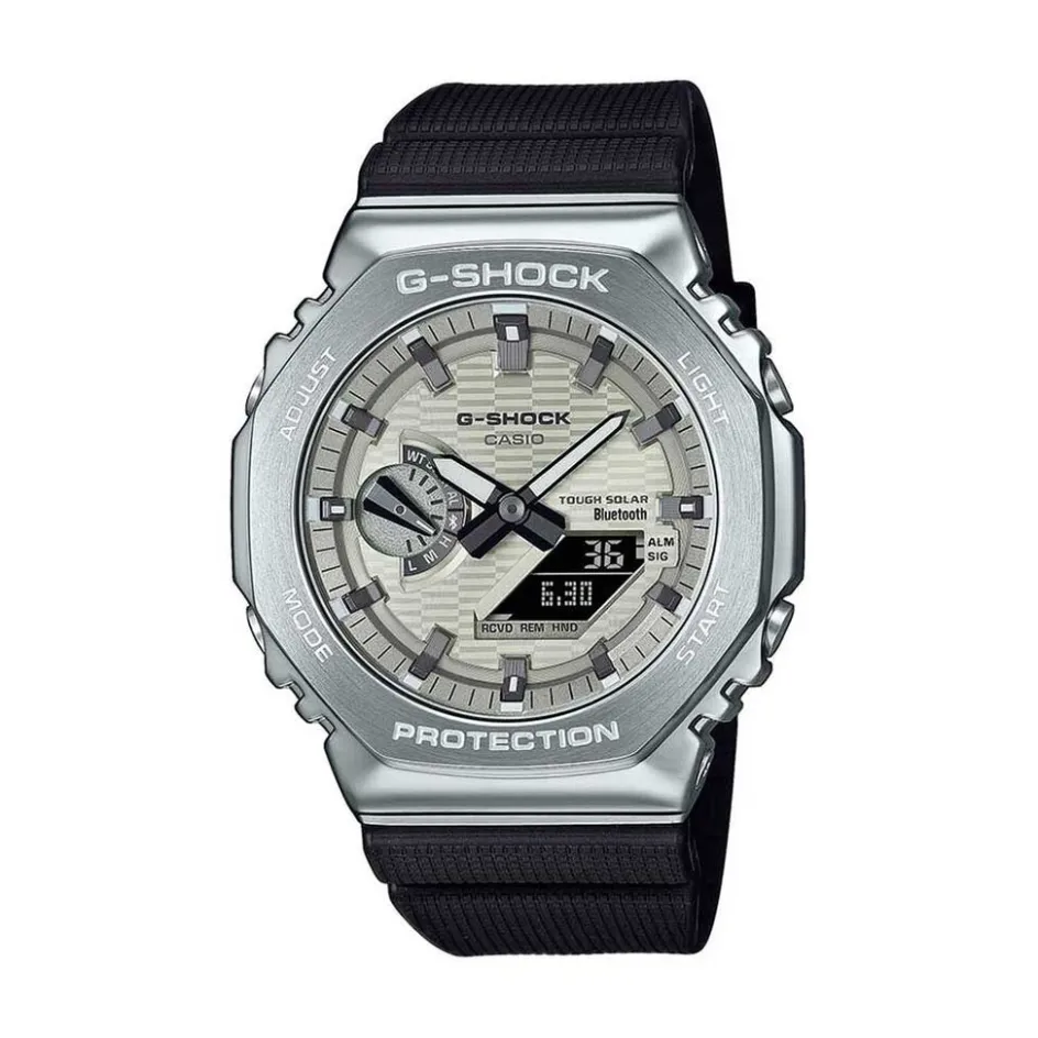 Montre Casio G-Shock Résine Argenté Quartz Solaire Anadigital Multifonction Octogone 44,4Mm Fond Gris Bracelet Résine Noir Gbm-2100A-8Ber