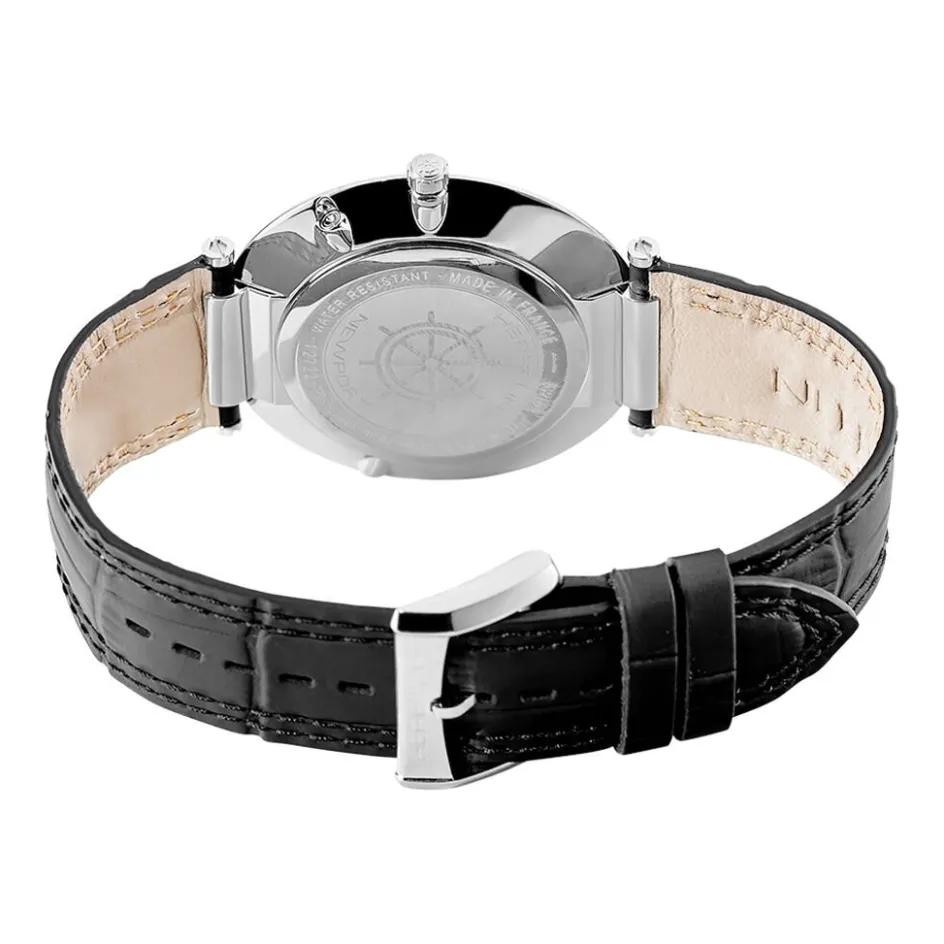 Montre Herbelin Newport Slim Acier Argente Ronde Quartz 41.5mm Fond Bleu Bracelet Cuir De Vachette Noir 12722ap15