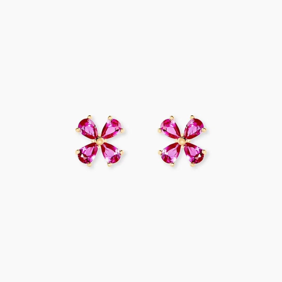 Bo Puces Or Jaune 375/1000 Fleur Oxyde De Zirconium Fuschia Serti 3 Griffes