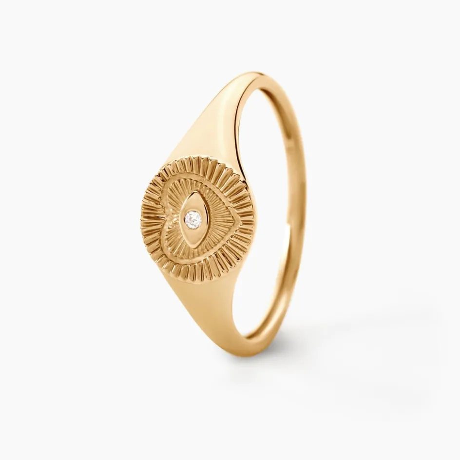 Chevaliere Or Jaune 375/1000 Plateau Rond Motif C艙ur 艙il Diamant Serti Clos