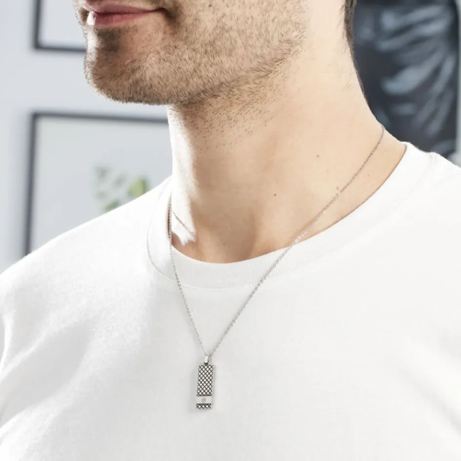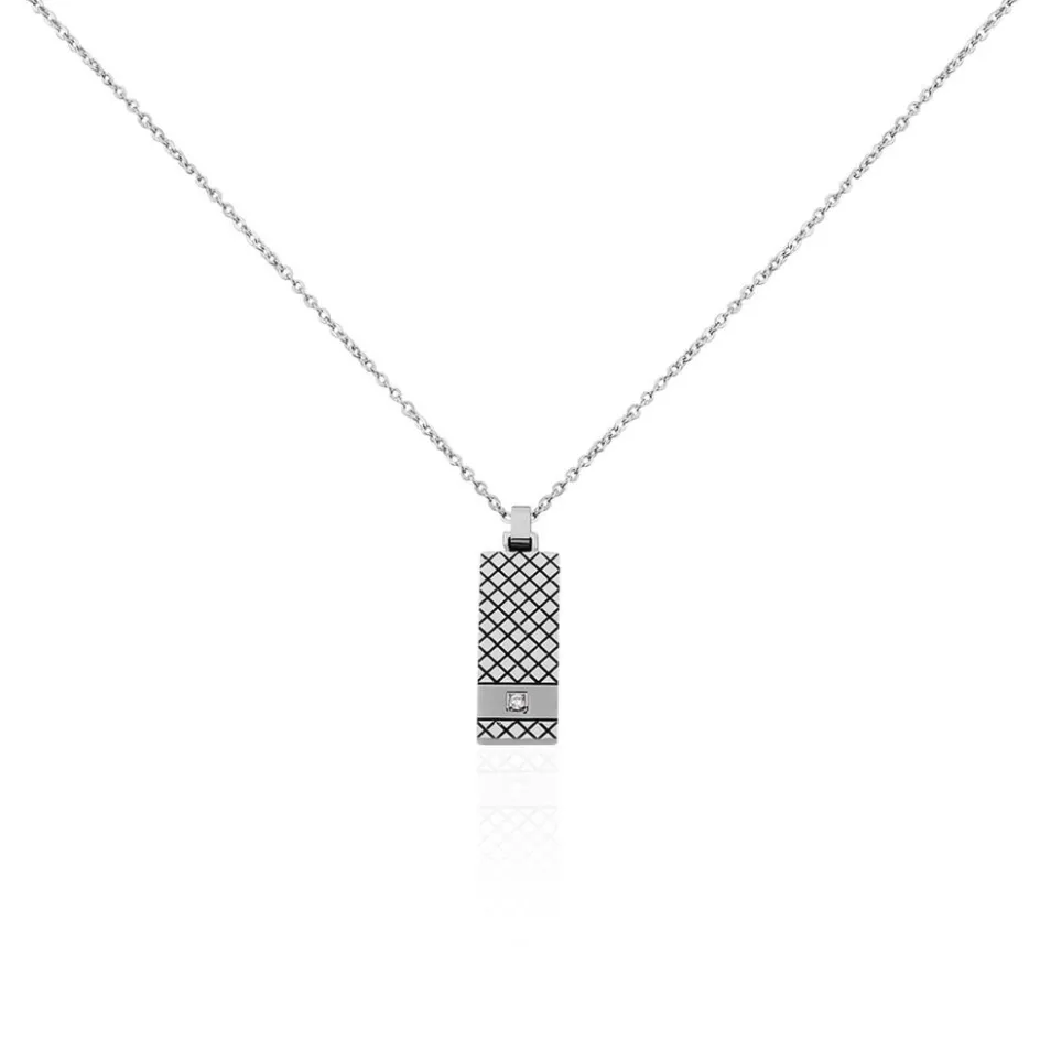 Collier Acier Blanc Quadrillage Acier Blanc Et Ip Noir Oxyde De Zirconium Chaine Boules 50cm