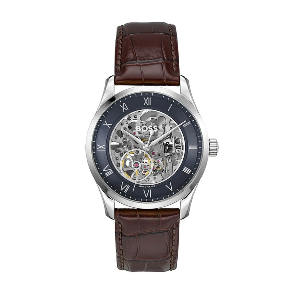 Montre Boss Principle Skeleton Acier Inoxydable Argenté Automatique Ronde 41Mm Fond Bleu Coeur Ouvert Bracelet Cuir De Veau Marron 1514305
