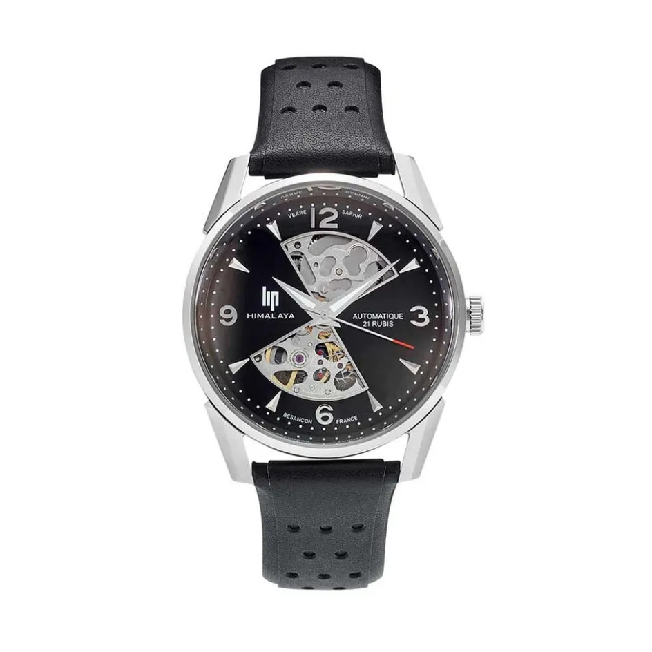 Montre Lip Himalaya Sablier Acier Argenté Rond Automatique 40mm Fond Noir Bracelet Cuir Noir 671573
