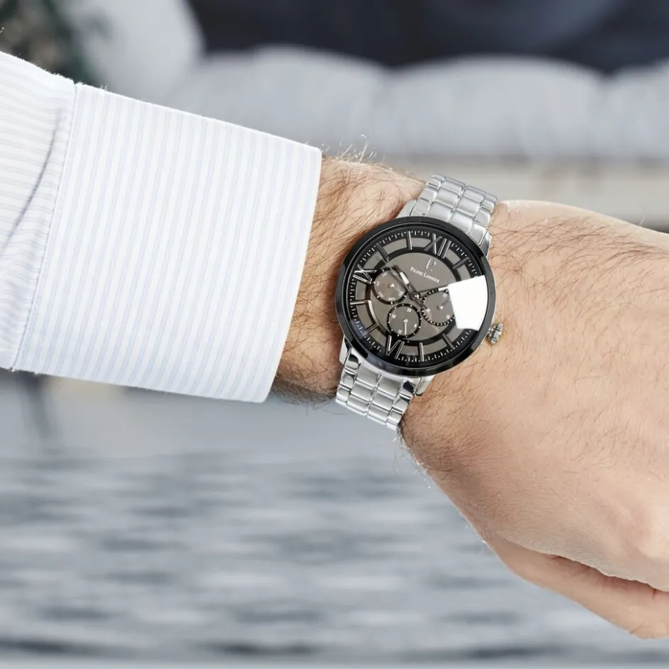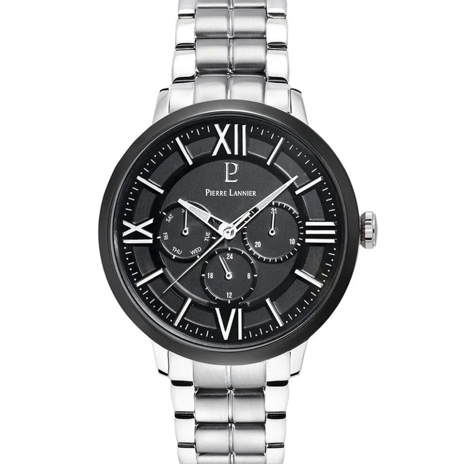 Montre Pierre Lannier Collection Beaucour Acier Blanc Ronde Quartz 42mm Fond Noir Bracelet Acier Blanc 256f131