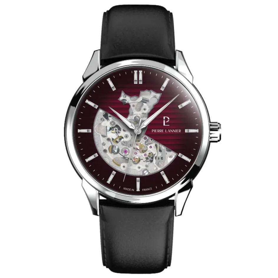 Montre Pierre Lannier Monarck Acier Inoxydable Argenté Automatique Ronde 43Mm Fond Bordeaux Coeur Ouvert Bracelet Cuir De Veau Noir 315D153