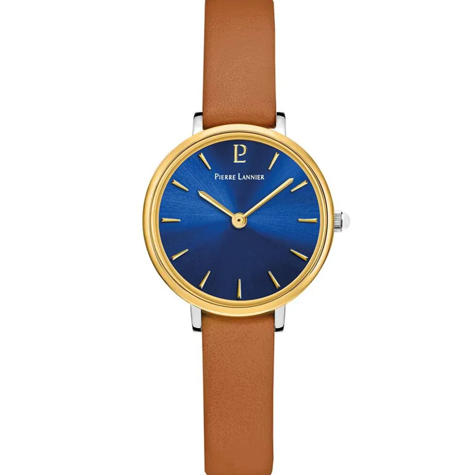 Montre Pierre Lannier Nova Acier Blanc Ronde Quartz 26mm Fond Bleu Lunette Doré Bracelet Cuir Brun 016n764