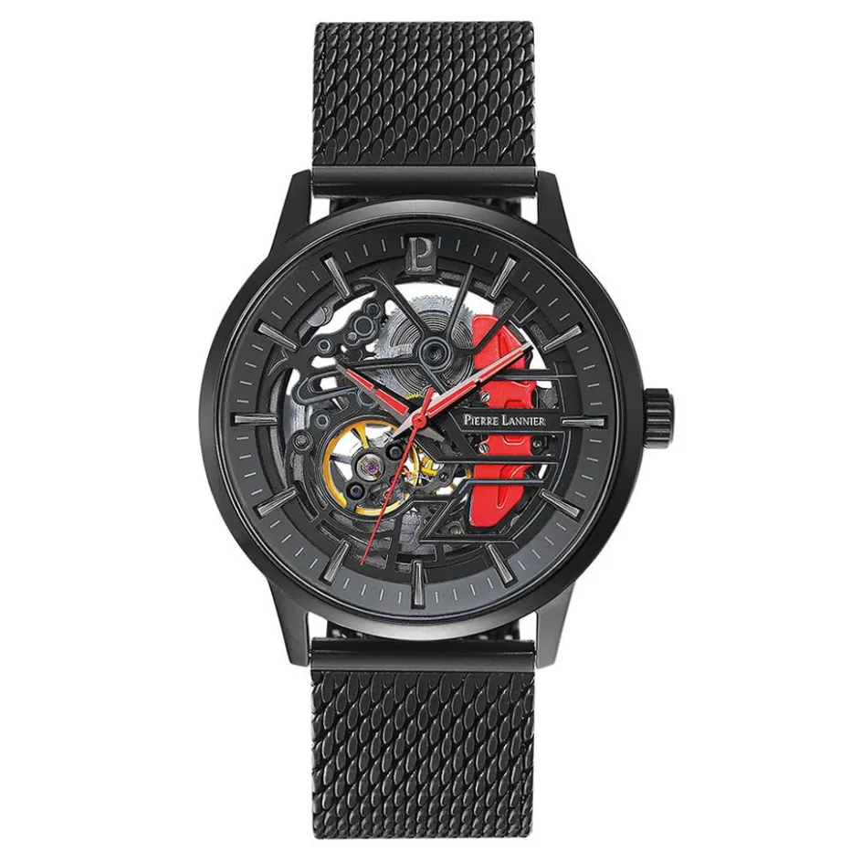 Montre Pierre Lannier Paddock Acier Noir Ronde Automatique 43mm Noir Fond Noir Bracelet Milanais Acier Noir 338a439