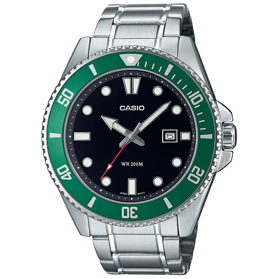 Montre Casio Collection Timeless Collection Acier Argenté Ronde Quartz 46.3mm Fond Noir Lunette Verte Bracelet Acier Argenté Mdv-107d-3avef