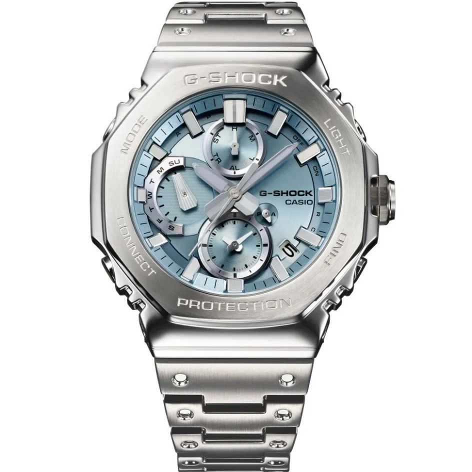 Montre Casio G-shock Premium Acier Argenté Ronde Quartz Solaire 46.3mm Multifonctions Fond Bleu Sky Bracelet Acier Argenté Gmc-b2100ad-2aer