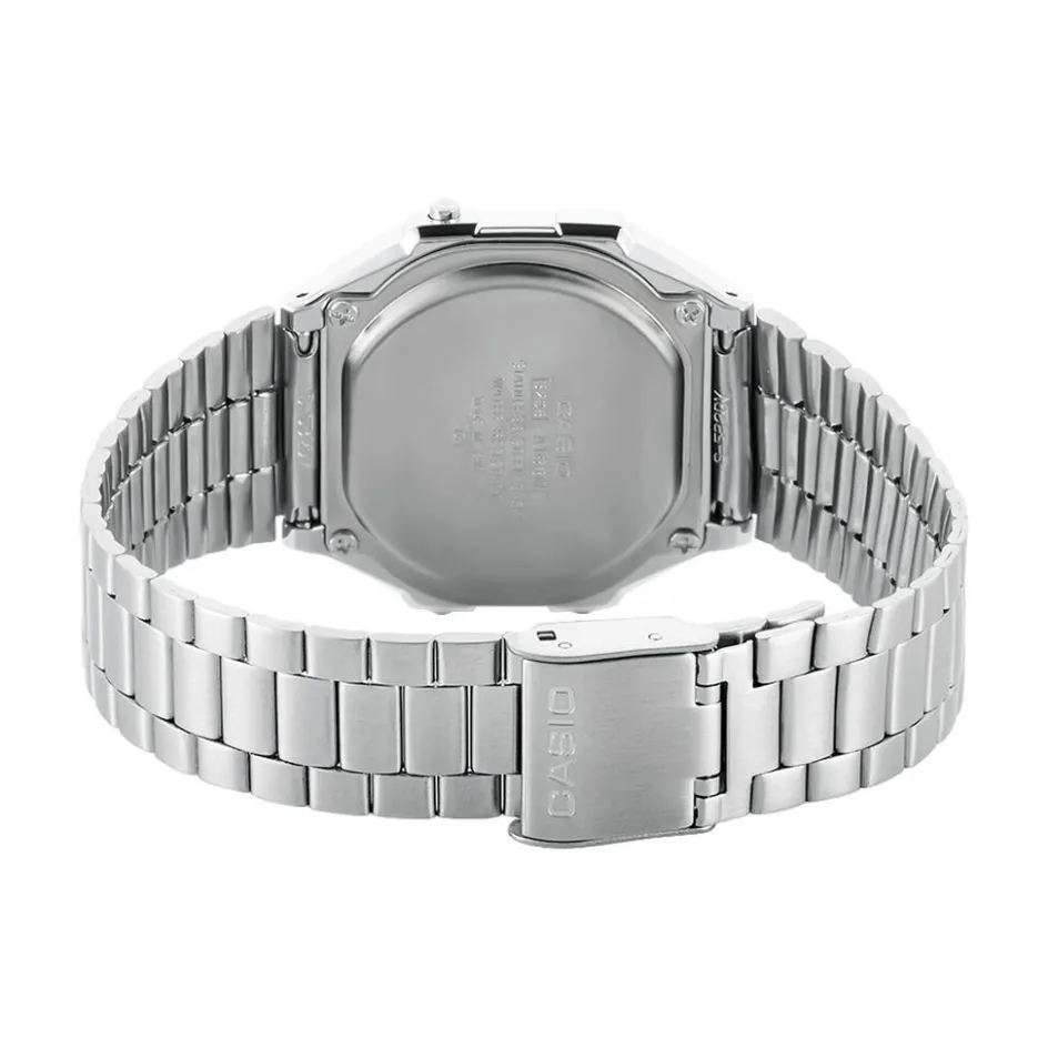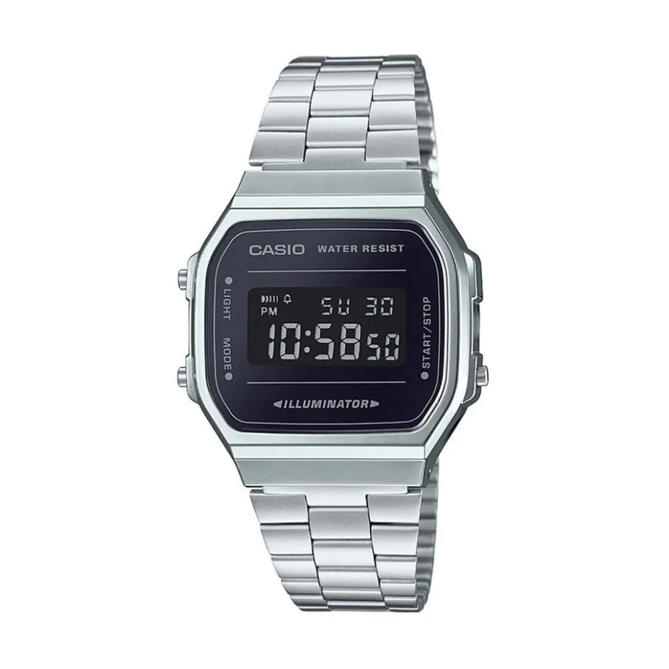 Montre Casio Collection Vintage Acier Blanc Carree Quartz 38mm Fond Noir Bracelet Acier Blanc A168wem-1ef