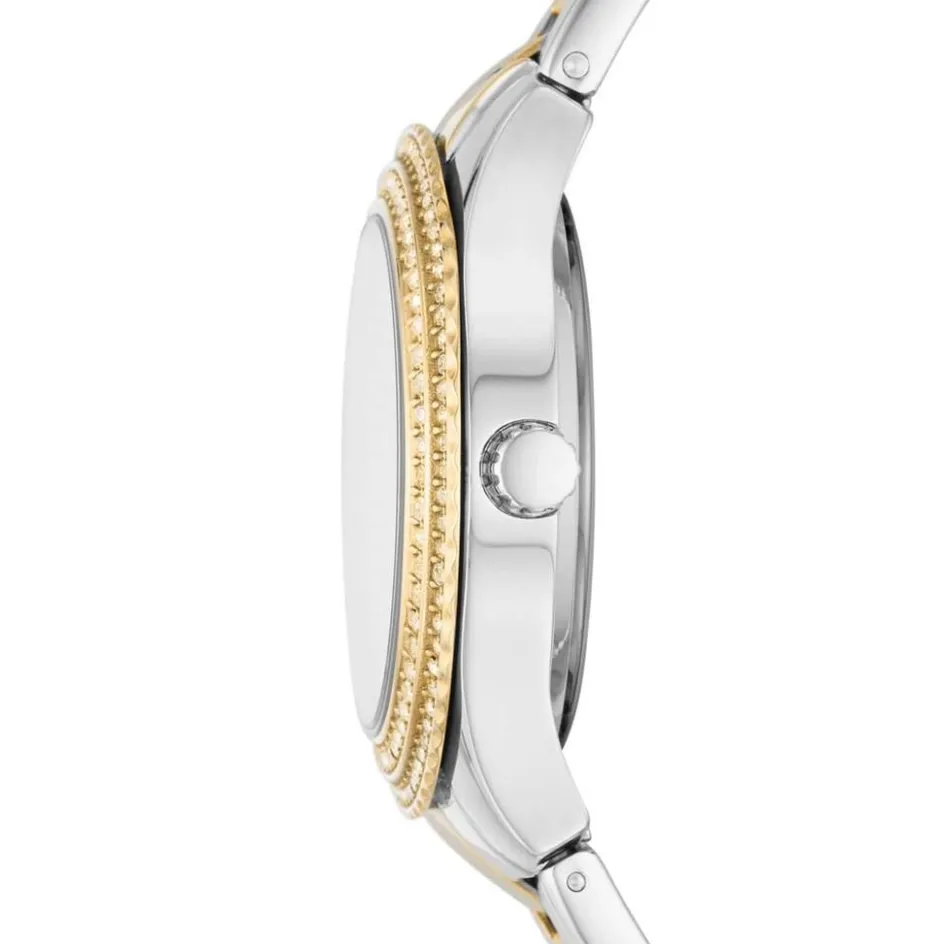 Montre Fossil Stella Acier Blanc Ronde Quartz Fond Nacré Blanc Lunette Dorée Strass Bracelet Acier Bicolore Es5138