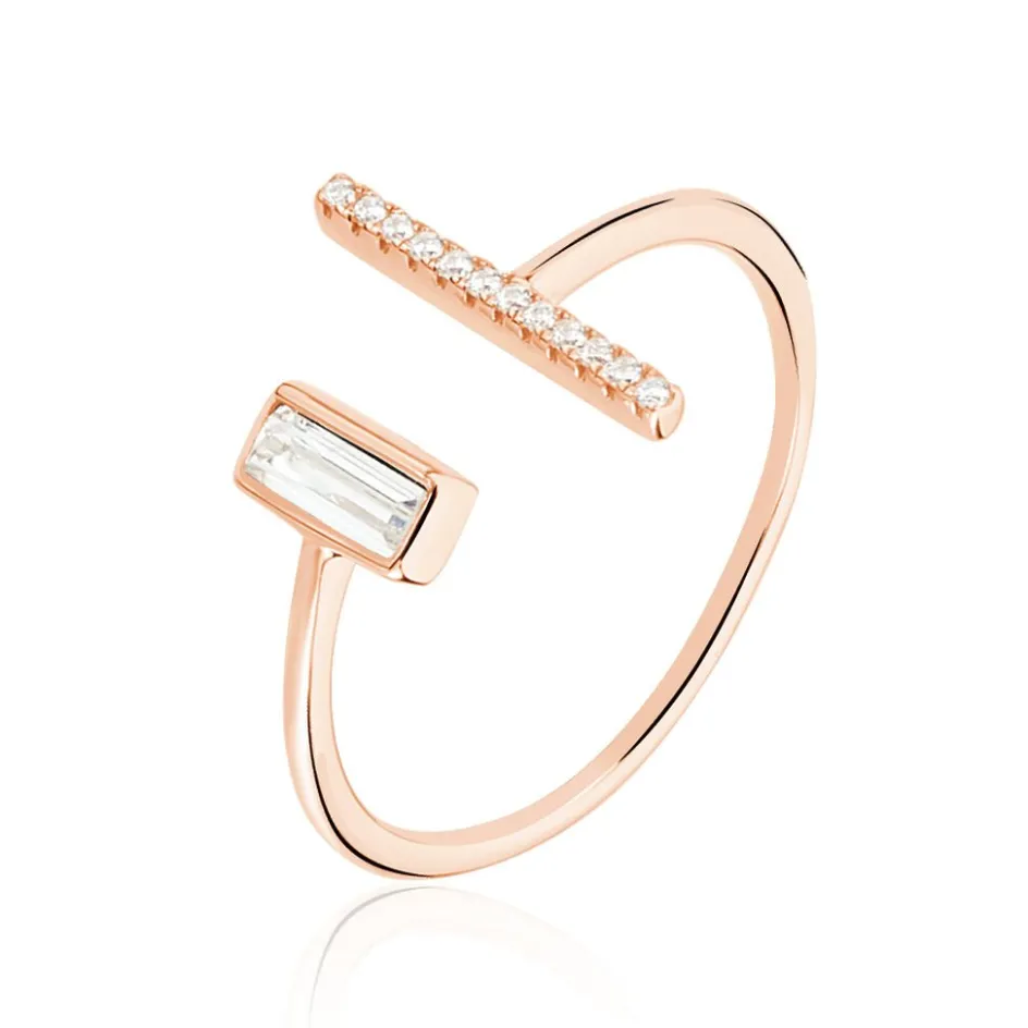Bague Argent Rose 925/1000 Ouverte Motifs Rectangulaire Et Barrette Oxydes De Zirconium