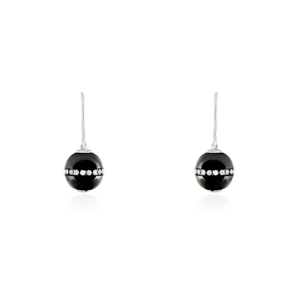Boucles D’oreilles Pendantes Argent Blanc 925/1000 Boules Ceramique Noires Rang Pierres Blanches