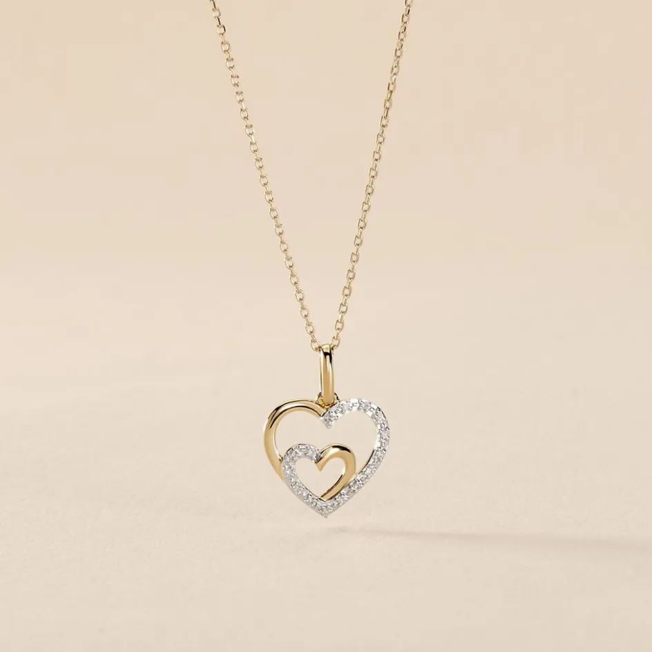 Collier Or Jaune 375/1000 Forme Double C艙ur Pavage Diamants Maille Forçat 42cm