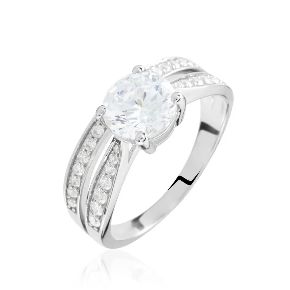 Solitaire Or Blanc 375/1000 Corps De Bague Double Oxyde De Zirconium Central Accompagne Oxydes De Zirconium