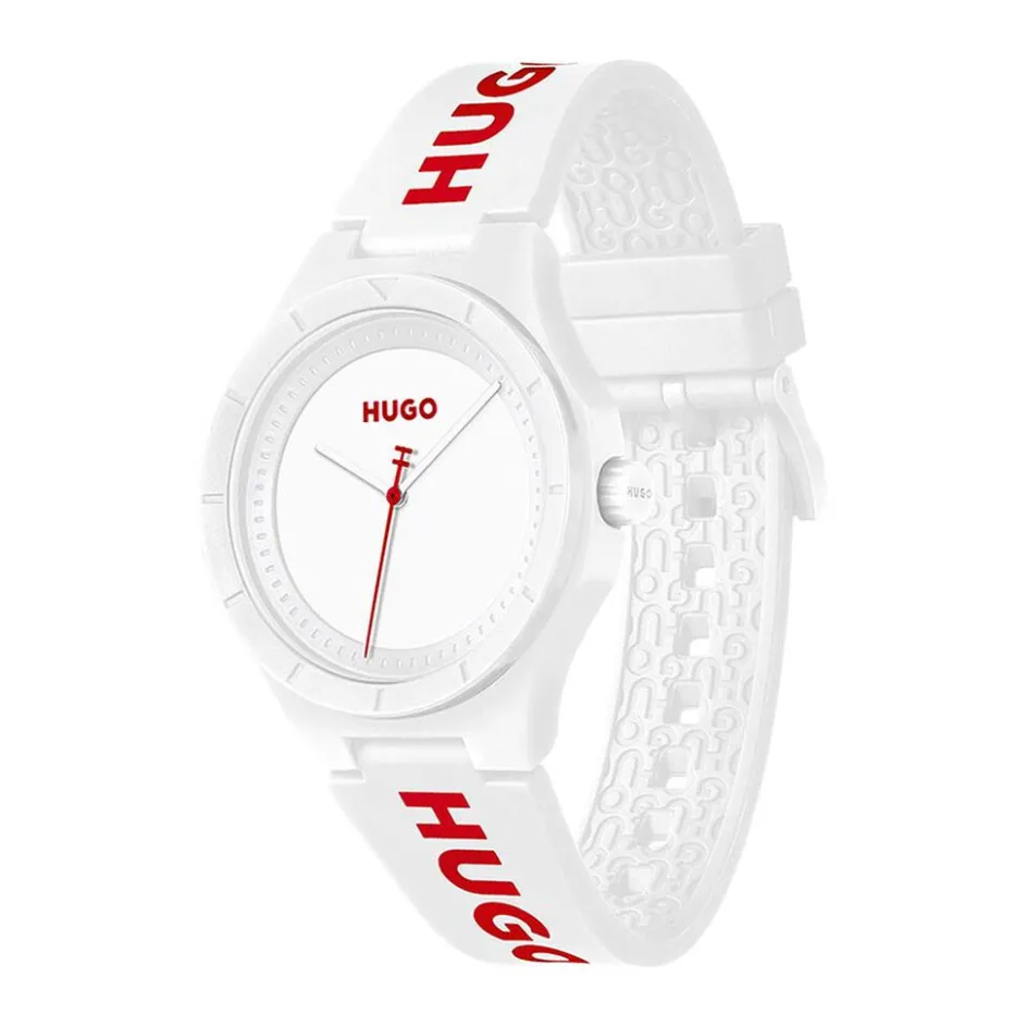 Montre Hugo Litforhim Acier Blanc Ronde Quartz 42mm Fond Blanc Bracelet Silicone Blanc Avec Lettre Rouge 1530345
