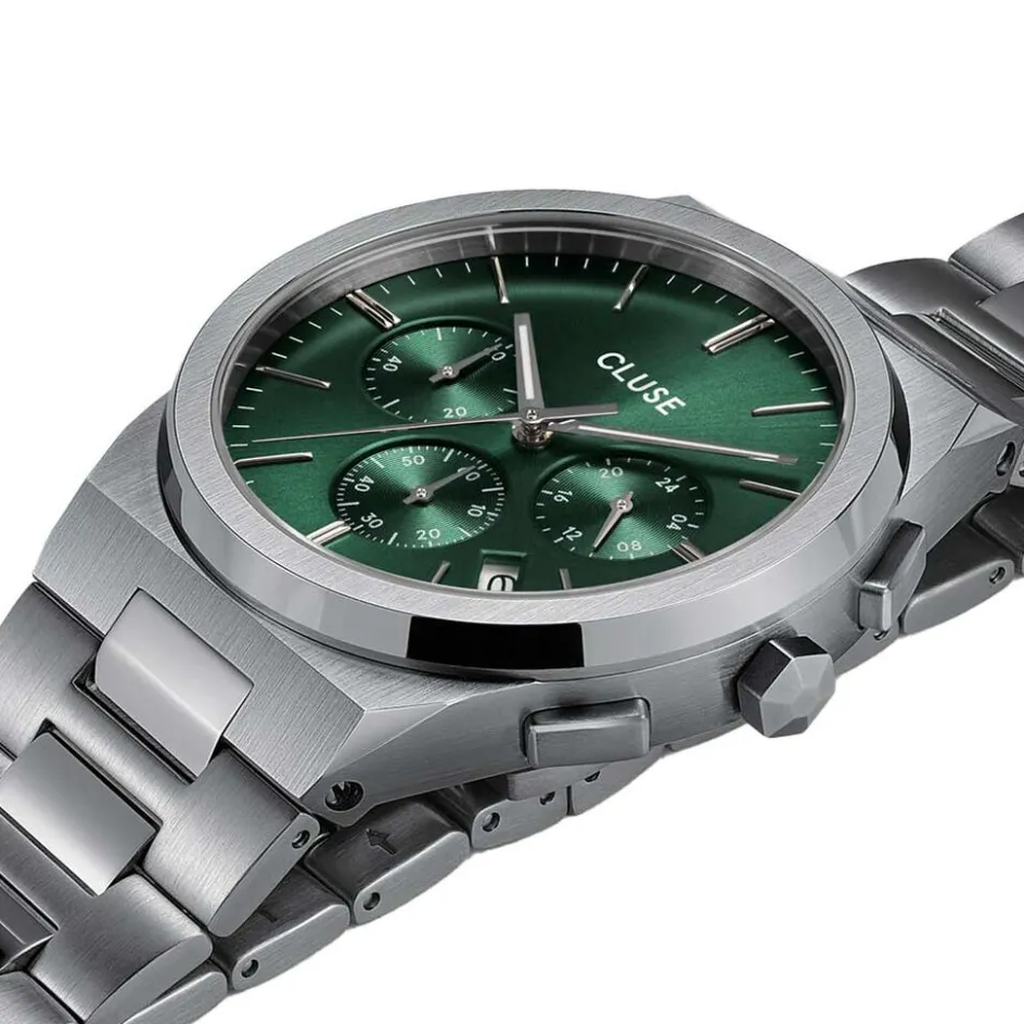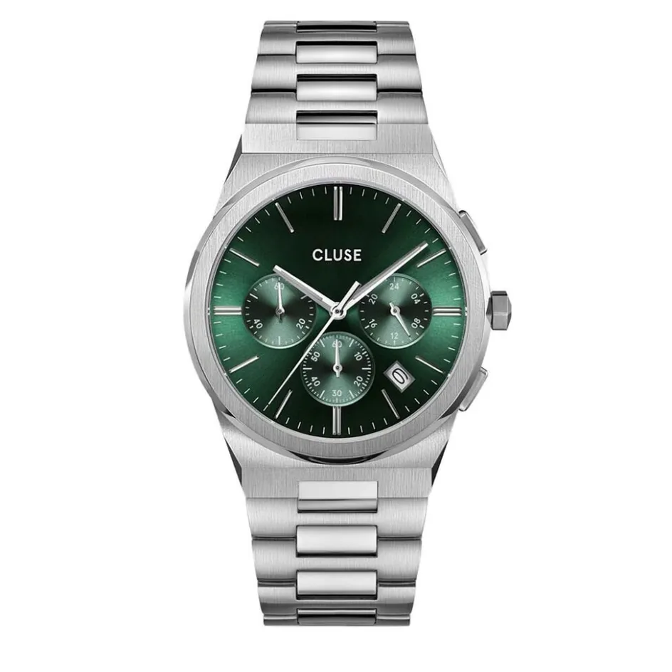 Montre Cluse Vigoureux Chrono Acier Argenté Ronde Quartz Chronographe 40mm Fond Vert Lunette Argenté Bracelet Acier Argenté Cw20803