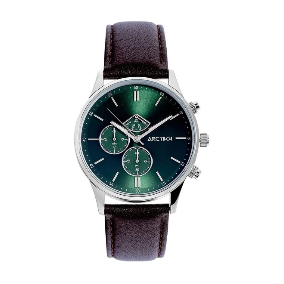 Montre Arctik Escale Acier Argenté Ronde Quartz Chronographe 42mm Fond Vert Bracelet Cuir Vachette Marron P100989-k