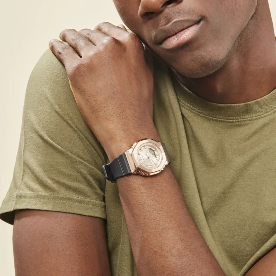 Montre Casio G-shock Acier Dorée Rosée Ronde Anadigitale 45mm Fond Dorée Rosés Bracelet Resine Noir A100we-1aef