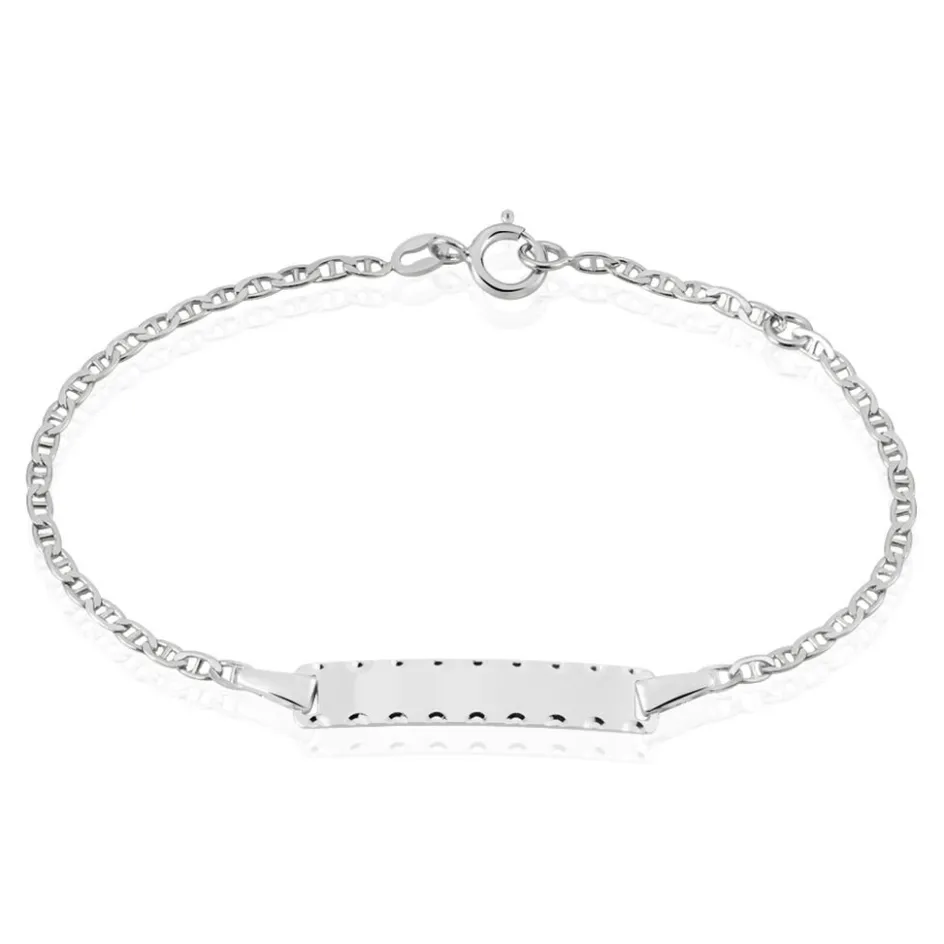 Bracelet Identite Bebe Or Blanc 375/1000 Plaque Rectangle Cisele Maille Forcat Marine 12/14cm