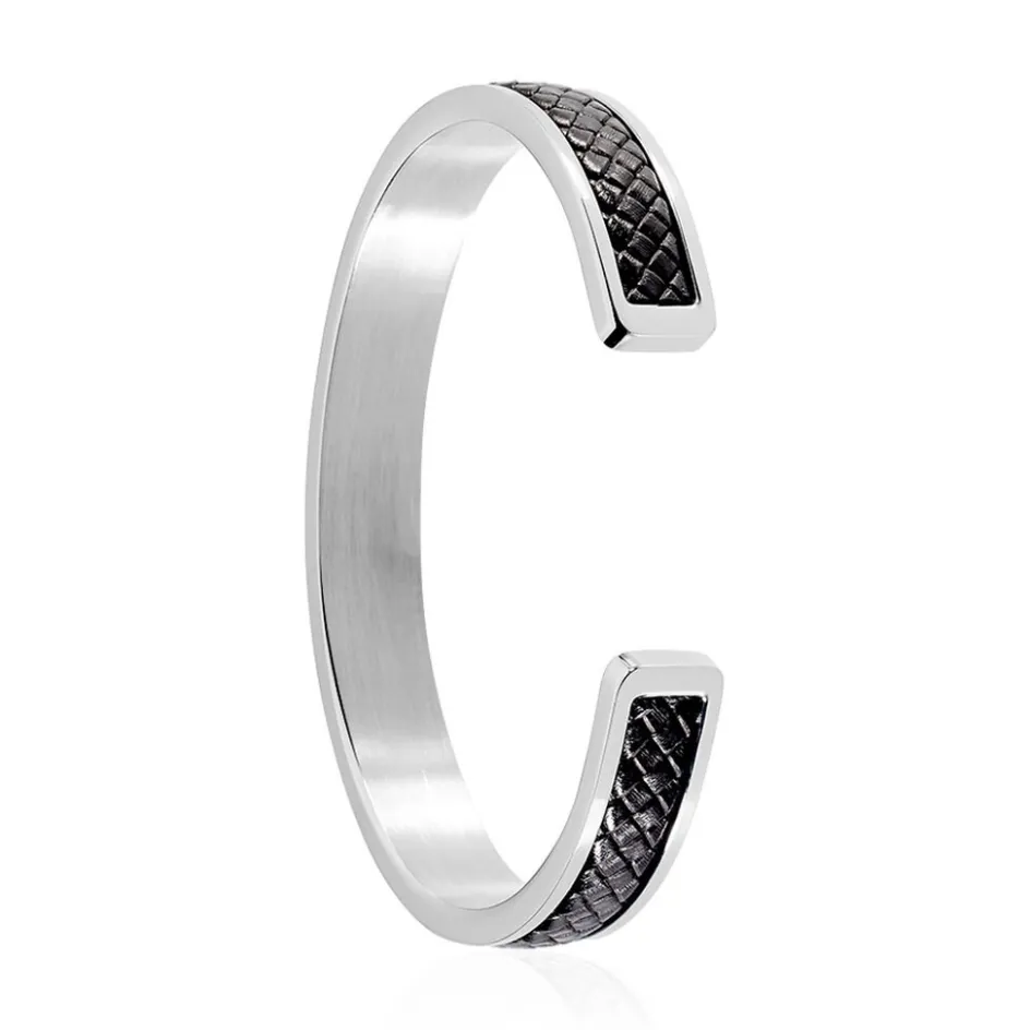 Jonc Acier Cuir Noir Effet Tresse Dia 70mm