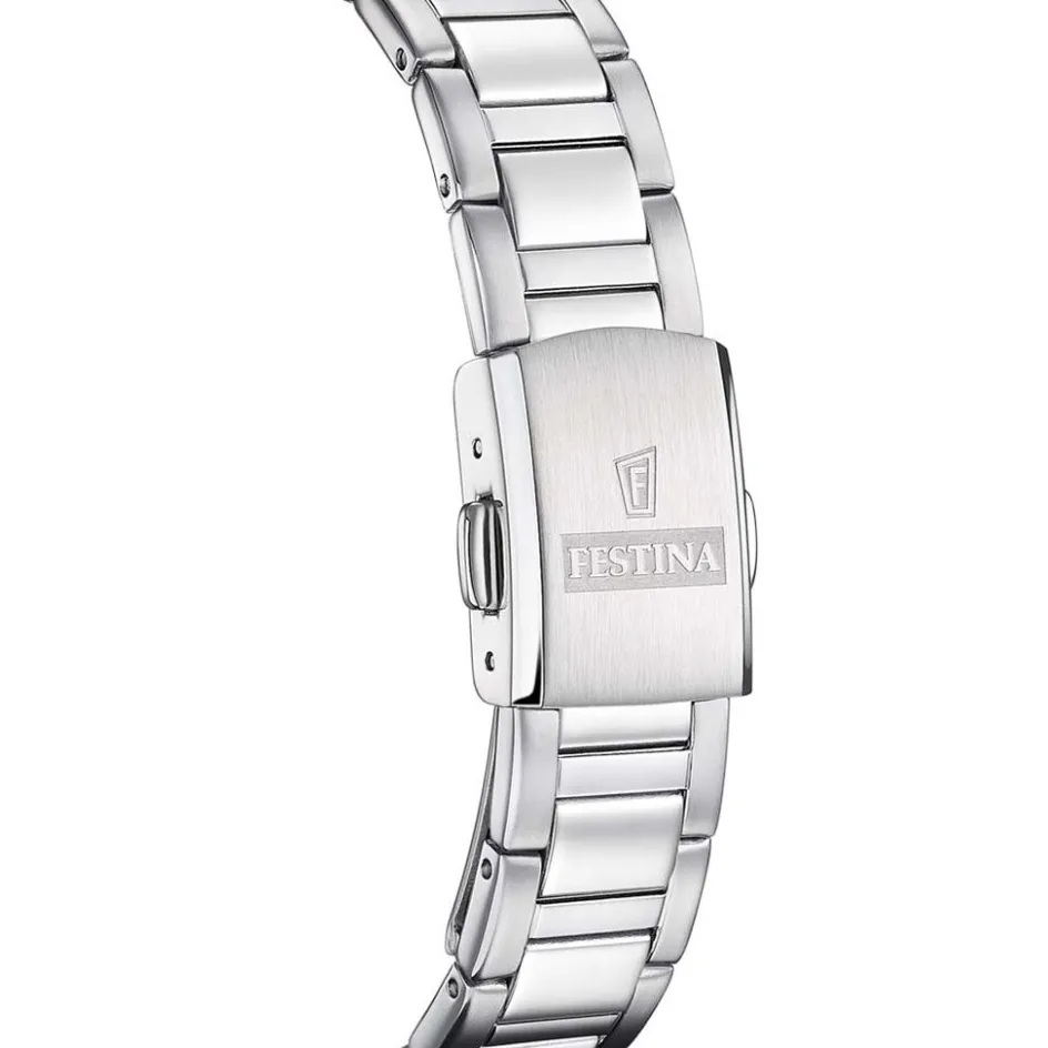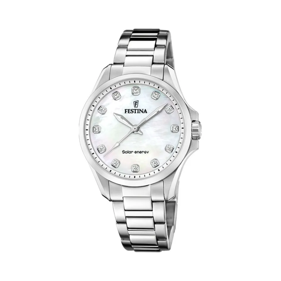 Montre Festina Solar Energy Acier Argenté Ronde Quartz 34mm Fond Nacre Blanche Et Strass Bracelet Acier Argenté F20654/1