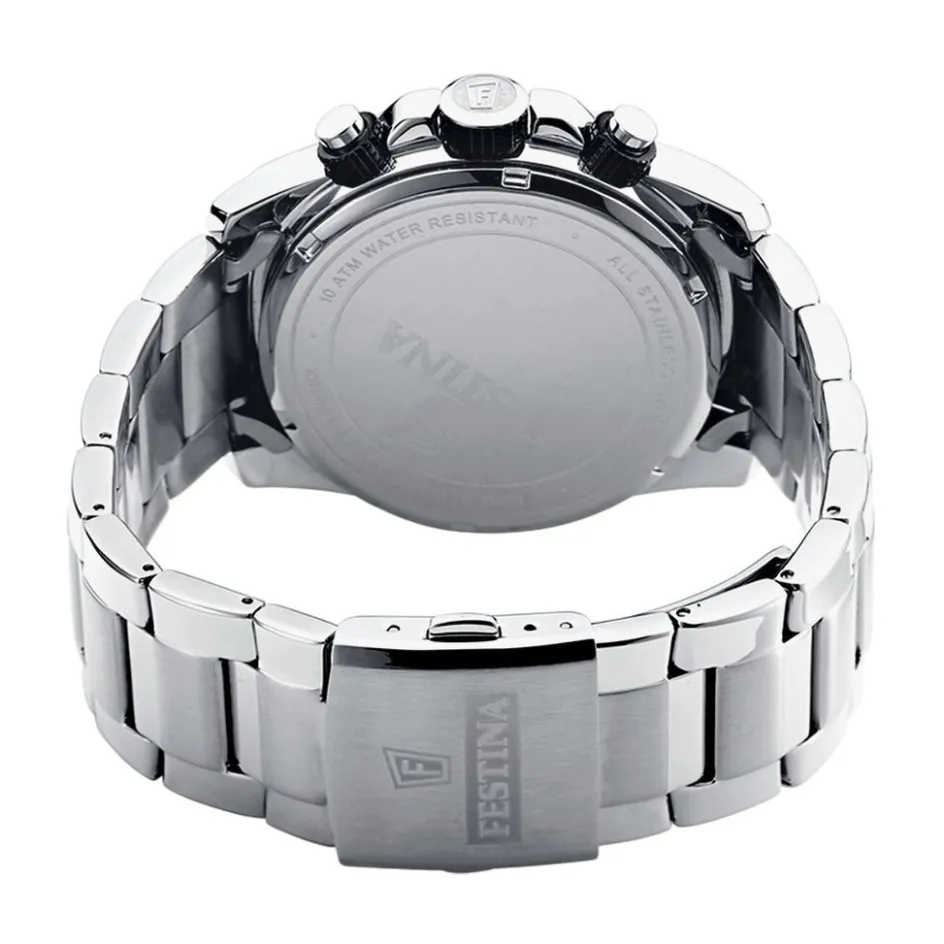 Montre Festina Timeless Chronograph Acier Blanc Ronde Quartz Chronographe 45mm Fond Noir Bracelet Acier Blanc F20463/4
