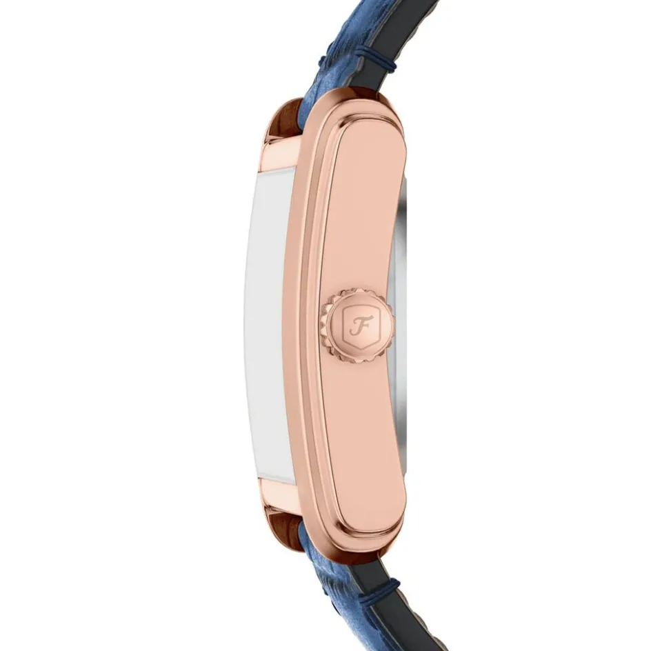 Montre Fossil Carraway Automatic Acier Inoxydable Dore Rose Automatique Rectangulaire 30Mm Fond Argenté C艙ur Ouvert Bracelet Cuir De Vache Bleu Me3274