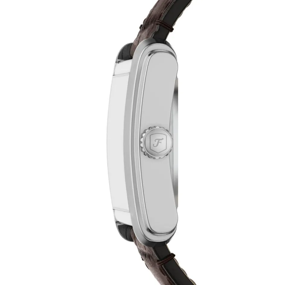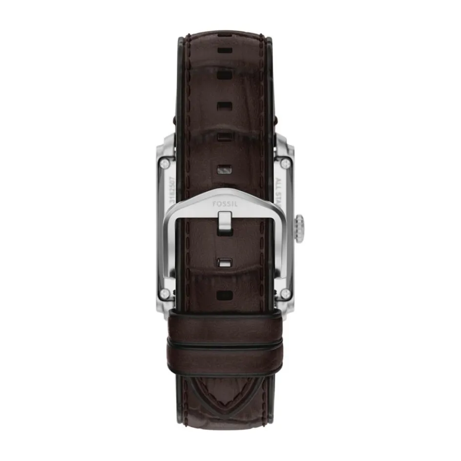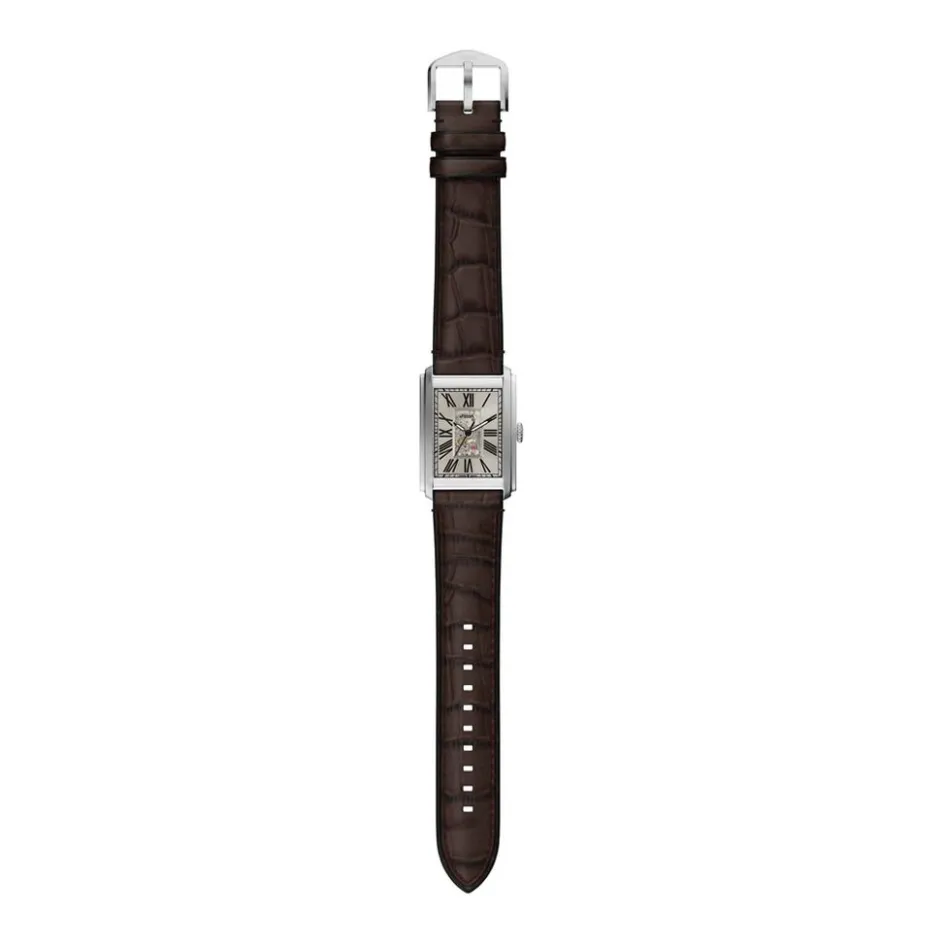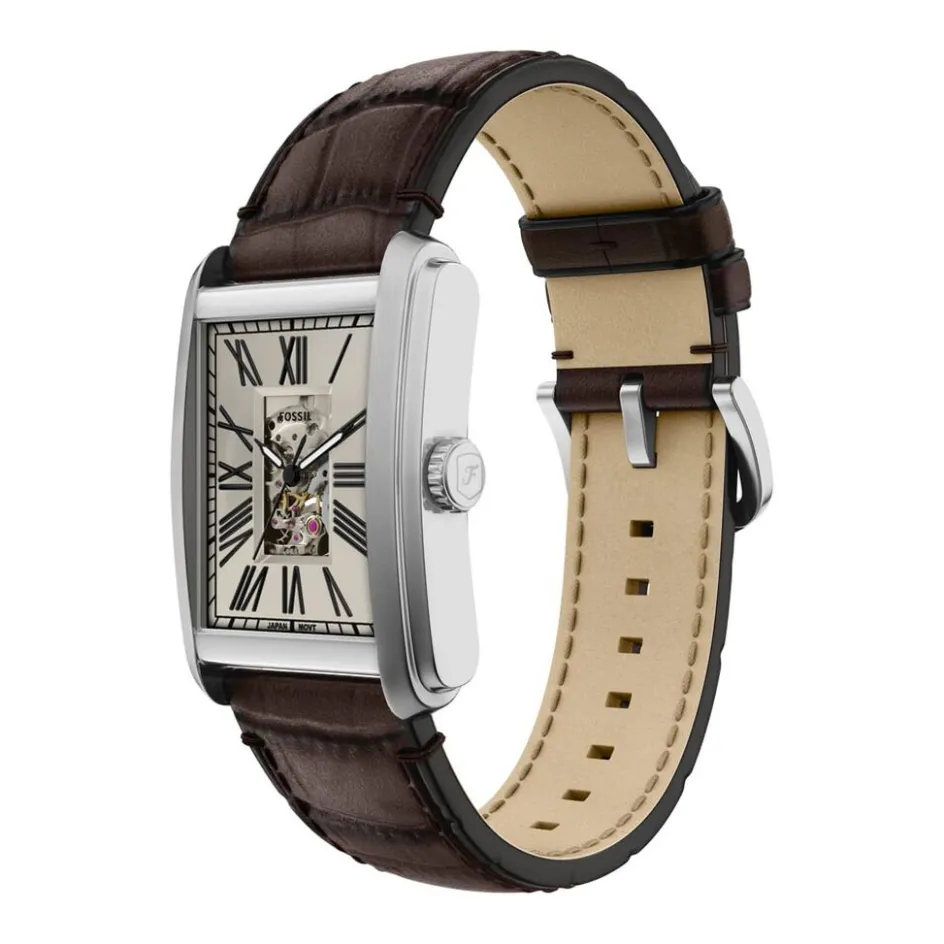 Montre Fossil Carraway Automatic Acier Inoxydable Argenté Automatique Rectangulaire 30Mm Fond Beige C艙ur Ouvert Bracelet Cuir De Vache Marron Me3272
