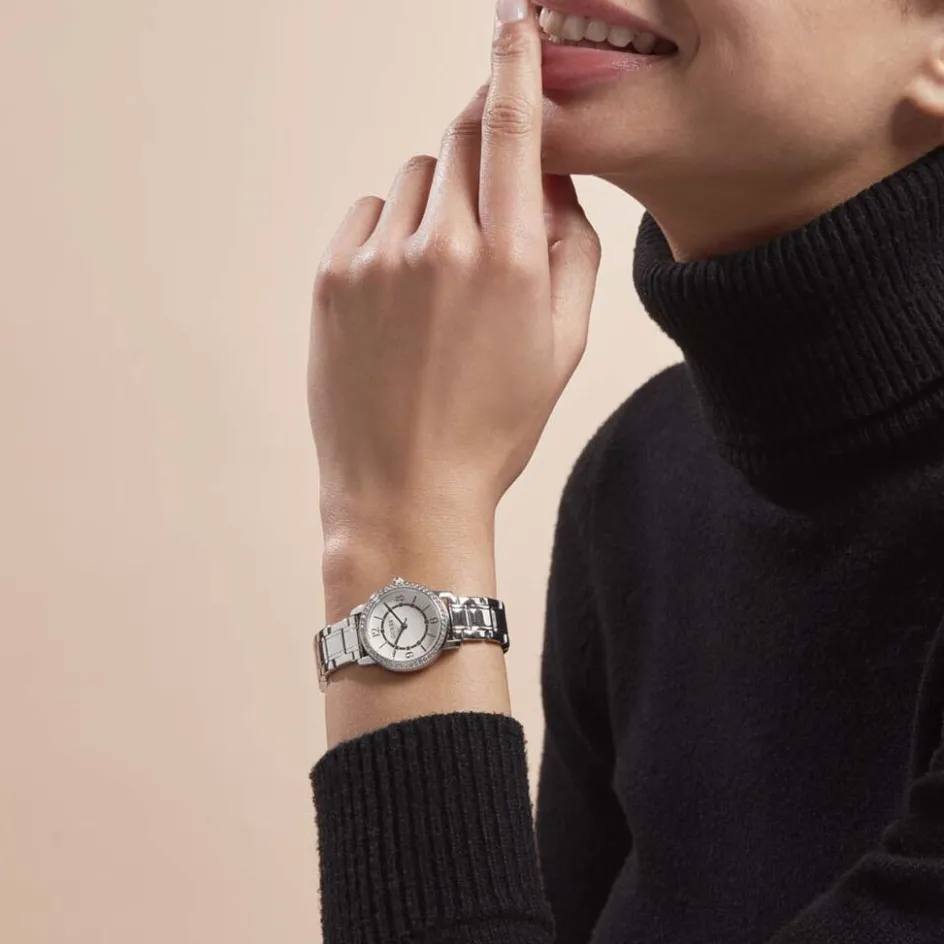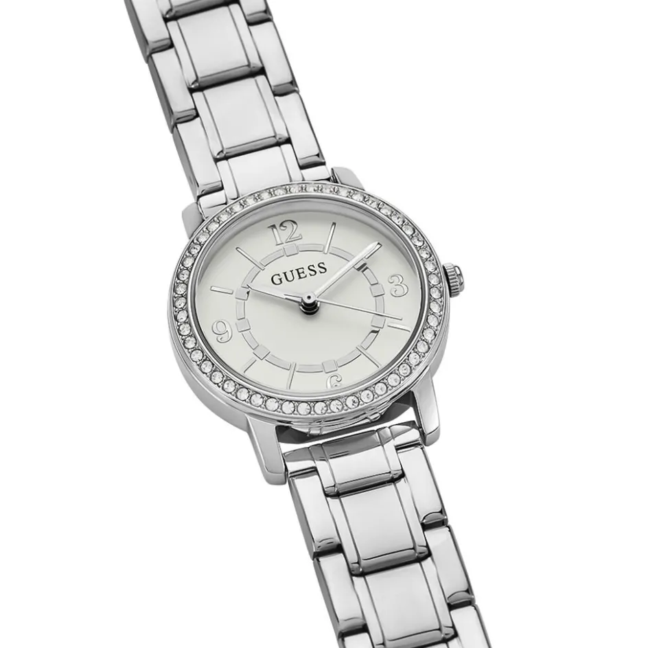 Montre Guess Melody Acier Ronde Quartz 28mm Fond Blanc Lunette Strass Bracelet Acier Gw0468l1