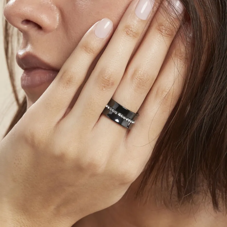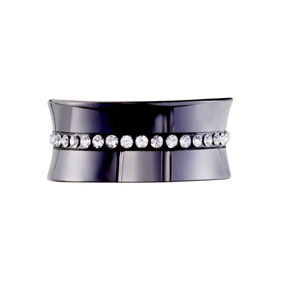 Bague Argent Blanc 925/1000 Ceramique Noire 1 Rang Strass