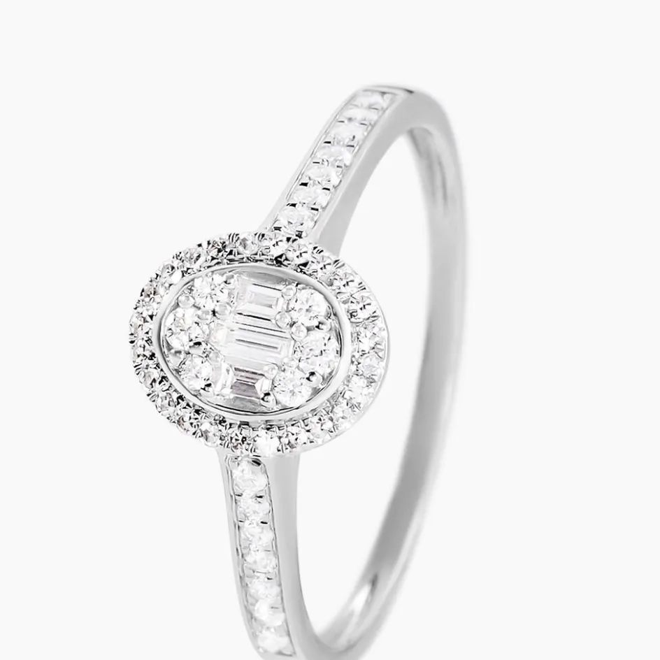 Bague Or Blanc 375/1000 Multipierres Ovale Diamants Baguettes 0.051cts Serti Pavage Entourage