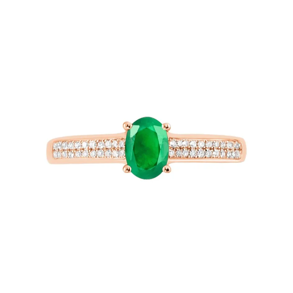 Bague Or Rose 375/1000 Emeraude Ovale Accompagnee Diamants Pm
