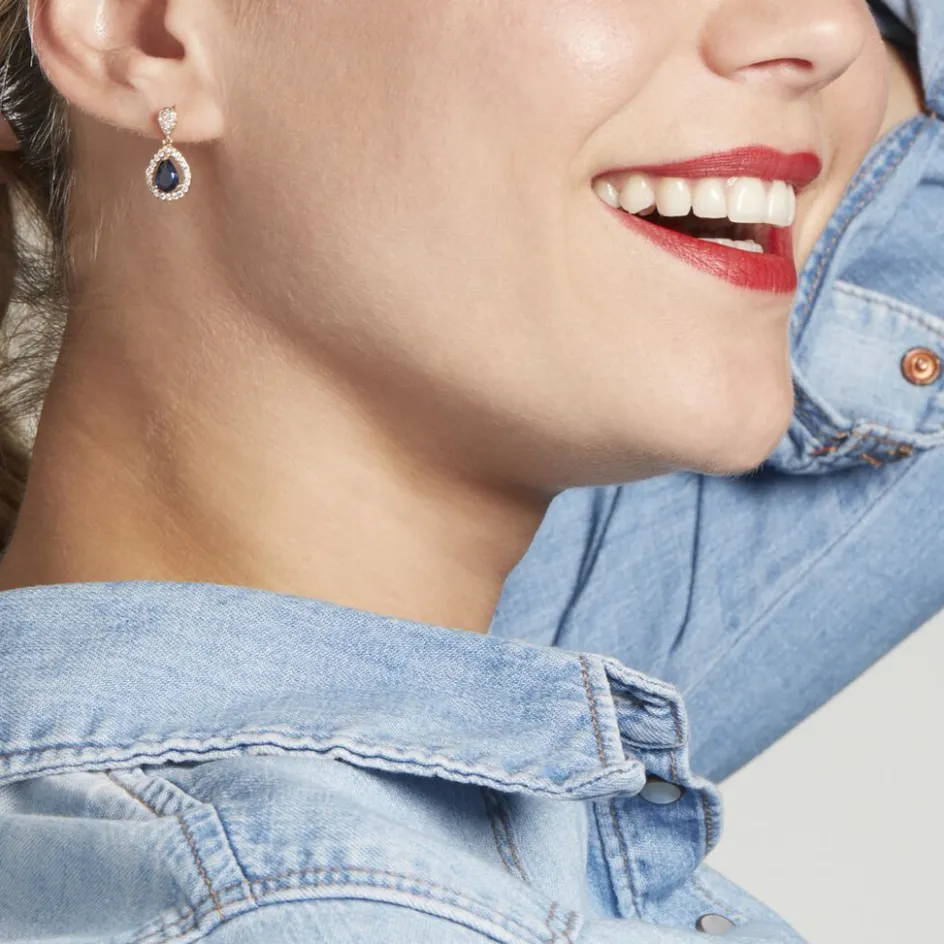 Boucles D’oreilles Plaqué Or Jaune Pierres Bleues Entourages Oxydes De Zirconium