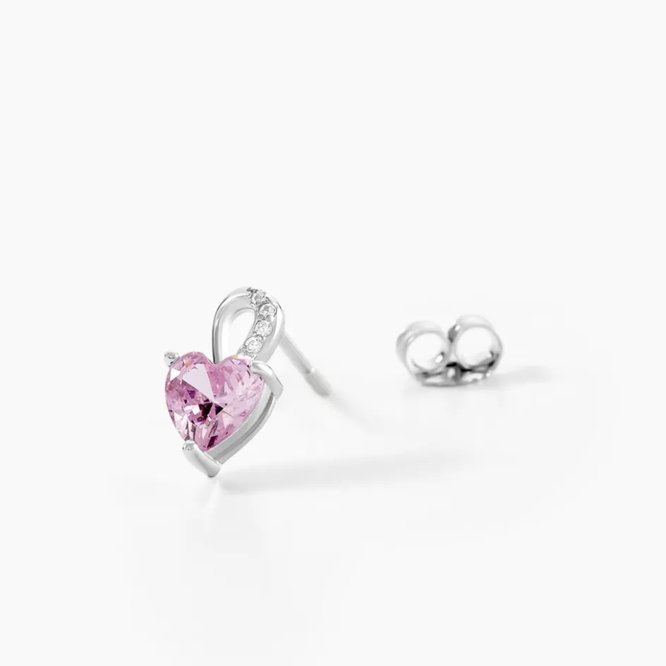 Boucles D’oreilles Puces Argent Blanc 925/1000 Coeur Rose Serti Griffes Accompagne Oxydes De Zirconium