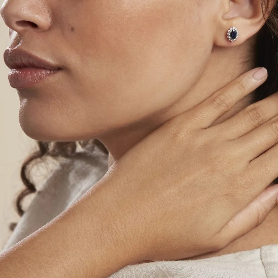 Boucles D’oreilles Or Blanc 375/1000 Saphir Simple Entourage Diamants Pm