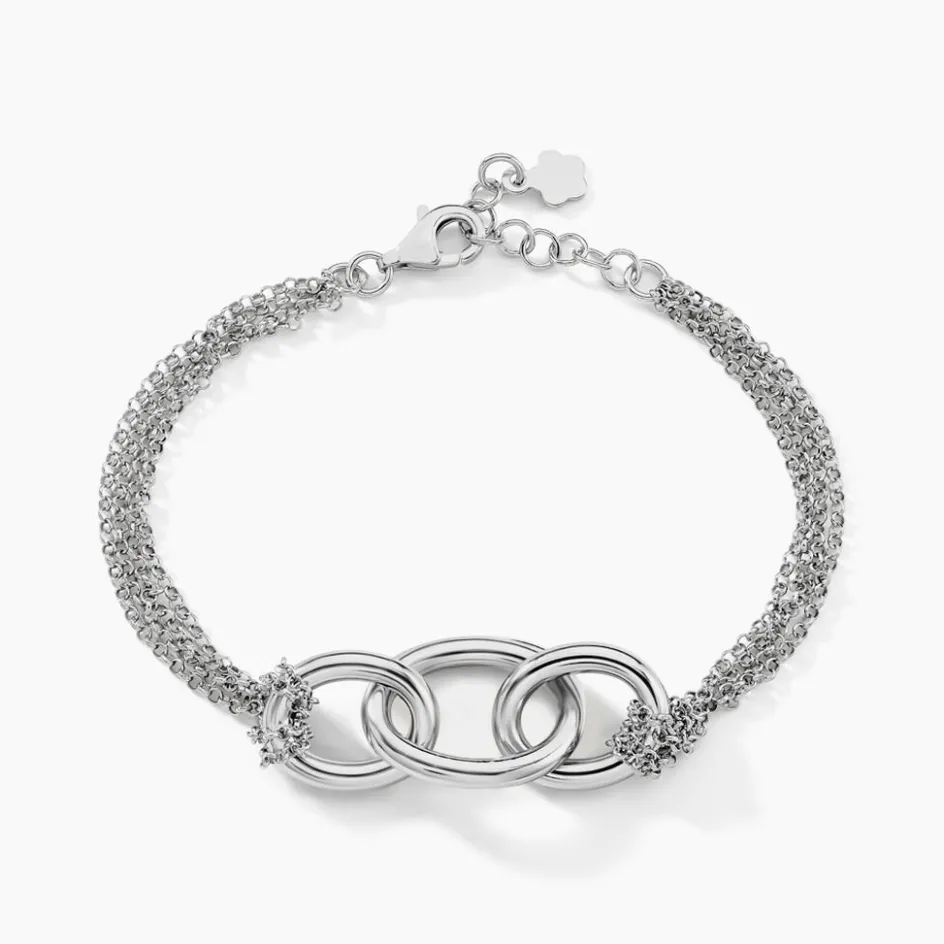 Bracelet Argent Blanc 925/1000 Triple Chaines Motifs Cercles Entrelaces Maille Forcat 18.5cm