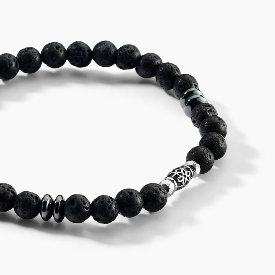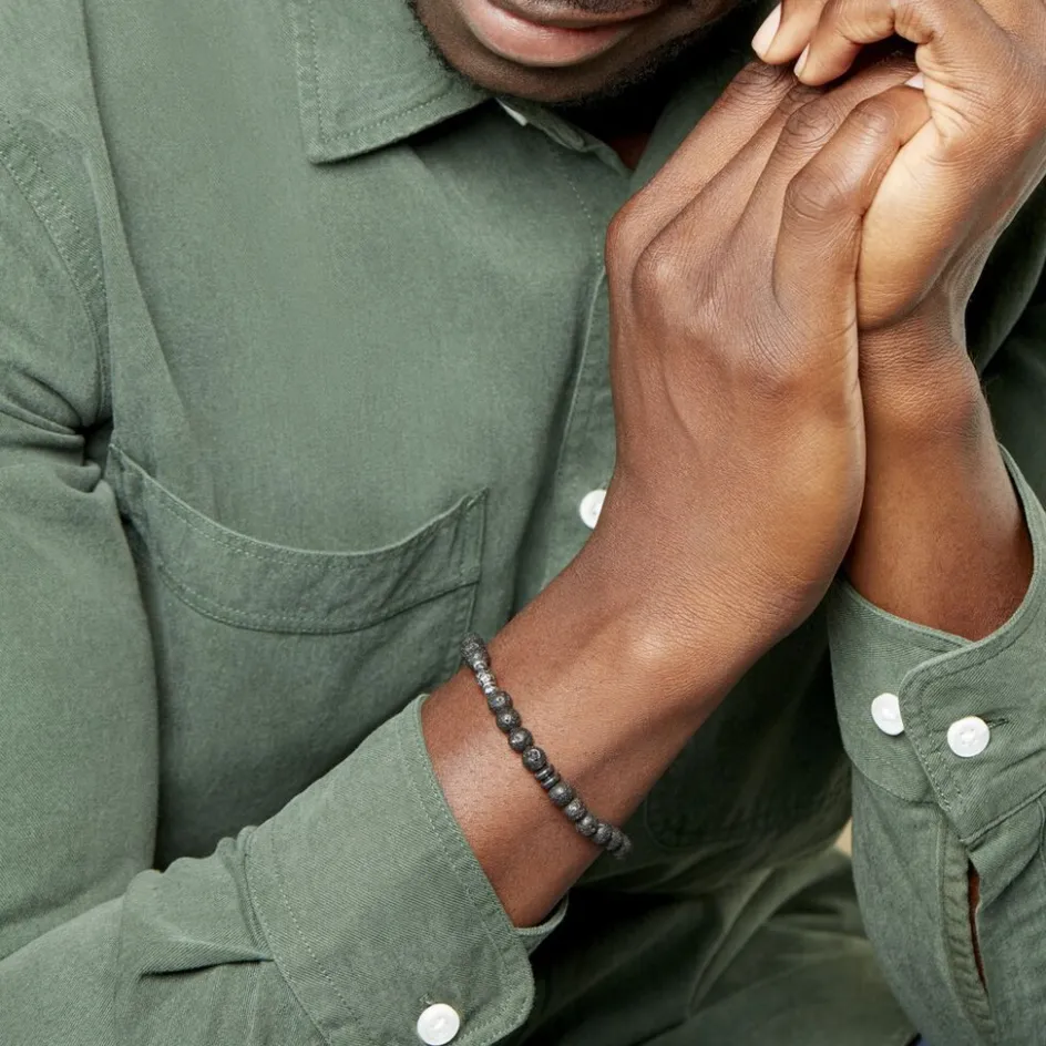 Bracelet Acier Inoxydable Blanc Boules Agates Noires Et Acier Inoxydable Blanc 21cm