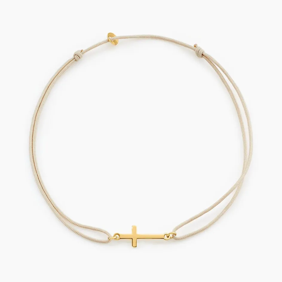 Bracelet Or Jaune 375/1000 Croix Sur Cordon Nylon Ajustable Beige