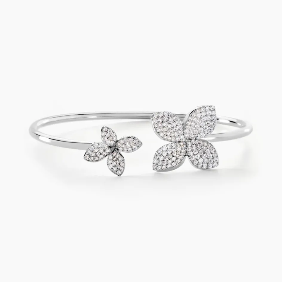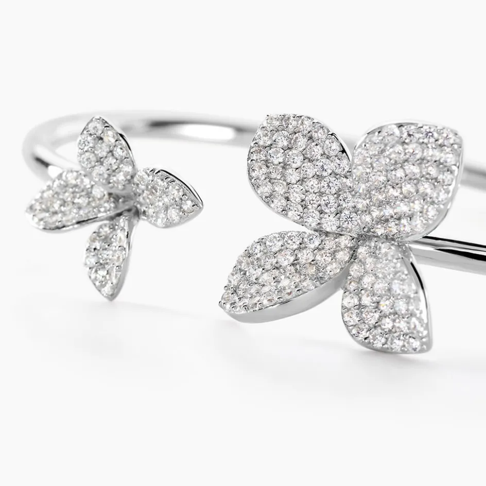 Bracelet Jonc Ouvert Argent Blanc 925/1000 Fleurs Pavage Oxydes De Zirconium Diamètre 58mm