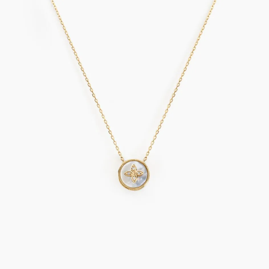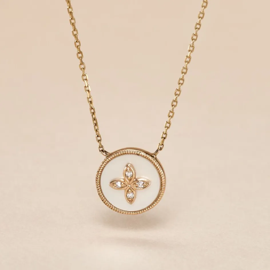 Collier Or Jaune 375/1000 Nacre Blanche Et Motif Fleur Diamants Maille Forçat 40+2cm