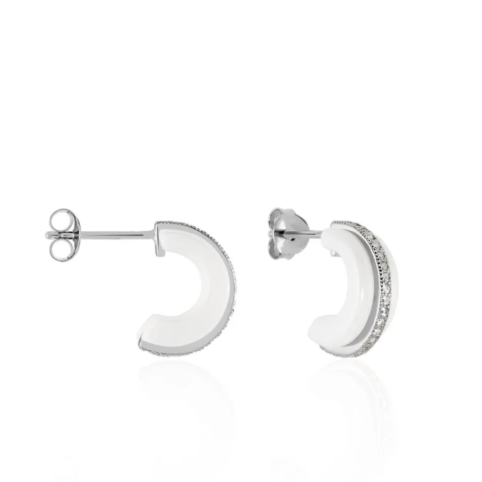 Demi Creoles Ceramik Design Argent Blanc 925/1000 Et Ceramique Blanche Pavage Oxydes De Zirconium