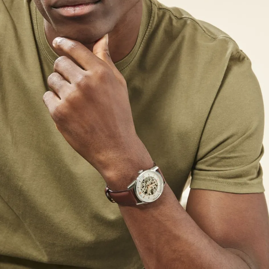 Montre Lip Himalaya Squelette Acier Argenté Ronde Automatique 40mm Fond Argente Bracelet Cuir Marron 671557