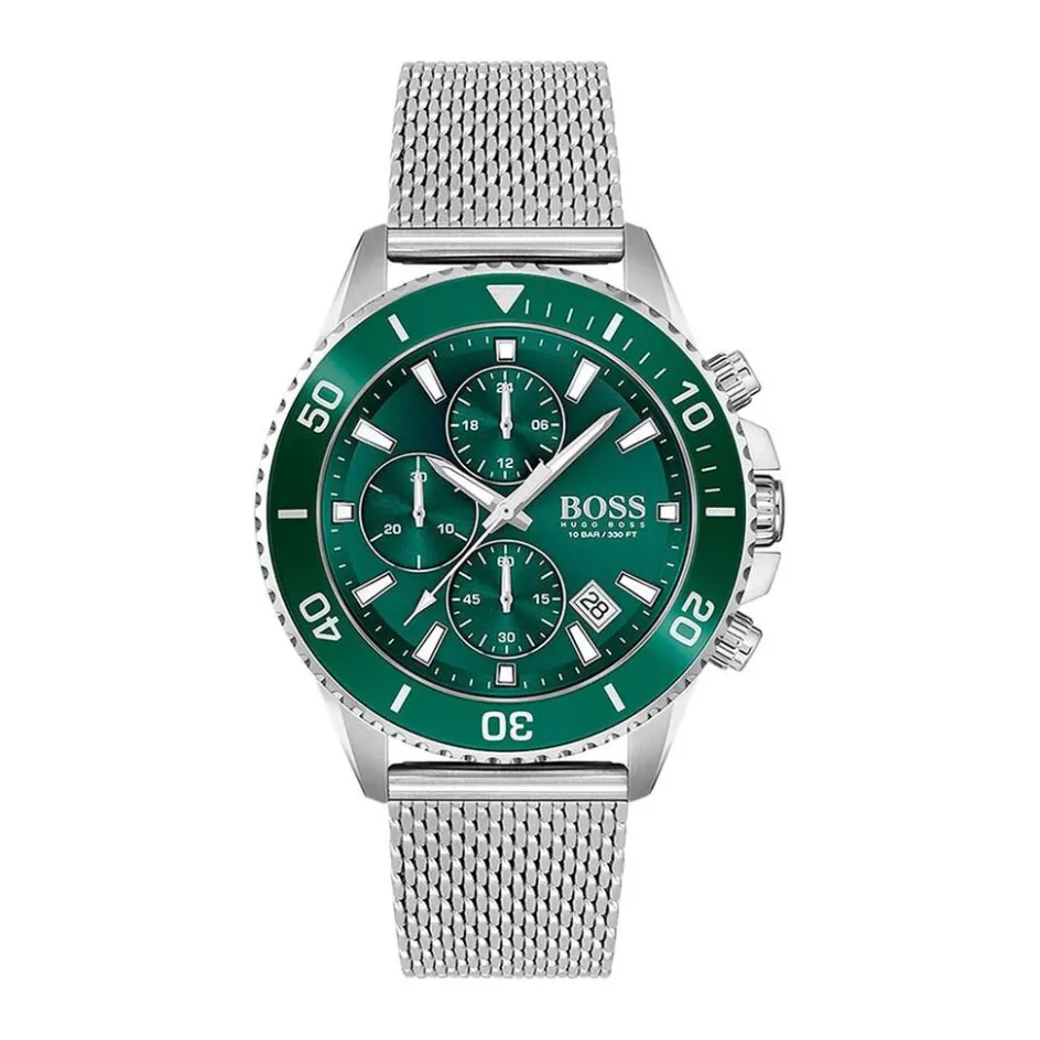 Montre Boss Admiral Acier Argenté Ronde Quartz Chronographe 45mm Fond Vert Bracelet Acier Maille Milanaise Argenté 1513905