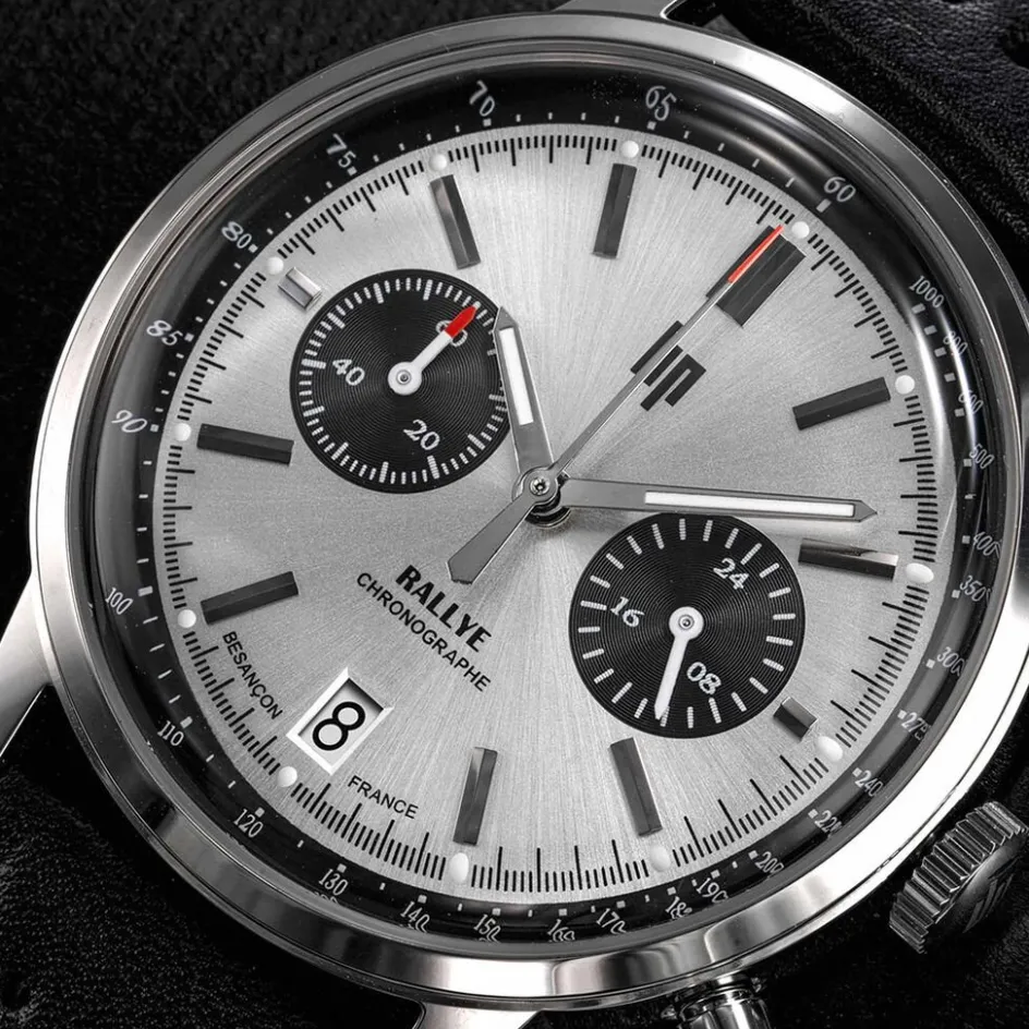 Montre Lip Rallye Panda Acier Argente Ronde Mecanique Quartz Chronographe 41mm Fond Argente Bracelet Cuir De Vache Noir 671811