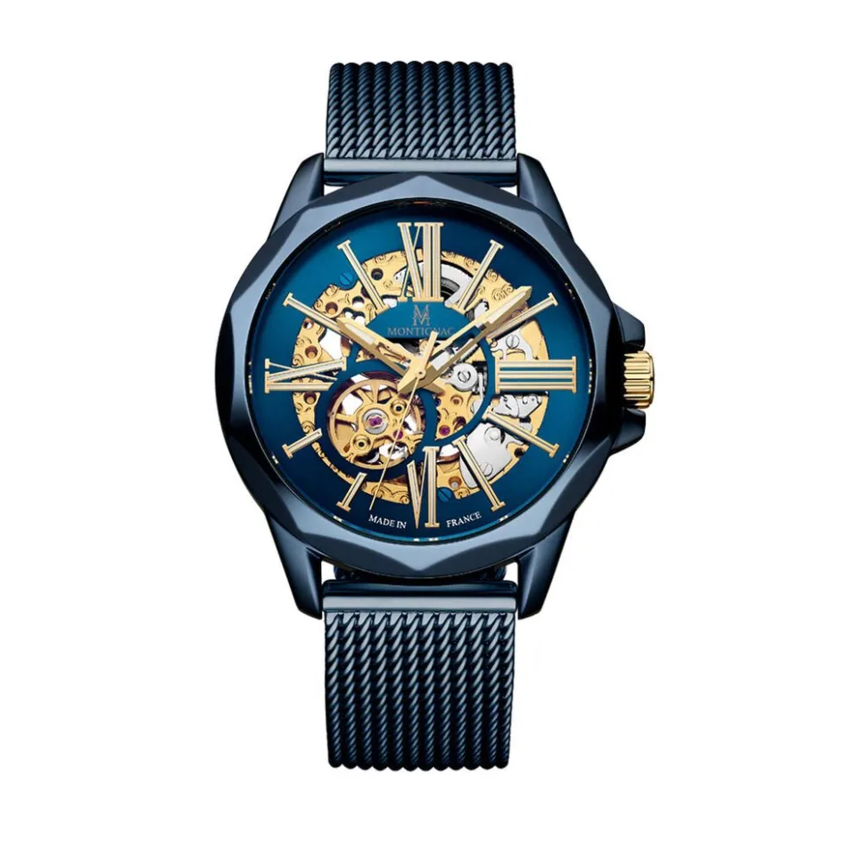 Montre Montignac Round Acier Inoxydable Bleu Automatique Ronde 42Mm Fond Bleu C艙ur Ouvert Bracelet Milanais Acier Inoxydable Bleu Mow1206