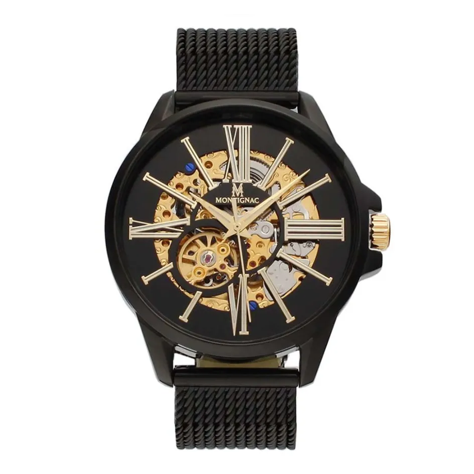 Montre Montignac Round Automatique Acier Noir Ronde Automatique 42mm Fond Noir Bracelet Acier Milanais Noir Mow405