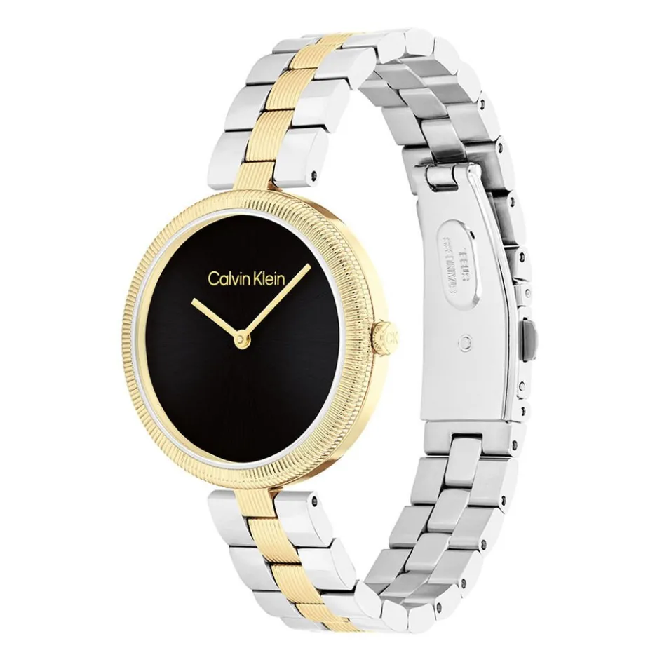 Montre Calvin Klein Gleam Acier Dore Rond Quartz 32mm Fond Noir Bracelet Acier Bicolore Dore Blanc Maillons 25100012
